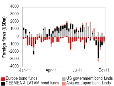 But flows into EM hard currency bond markets have tentatively recovered from September’s mass outflows, the report shows. last week’s net flow into EM hard currency bond funds, turned positive for the first time in five weeks, totaling $92 million. The previous week’s net flow was $221 million.