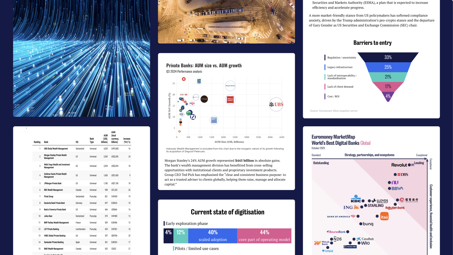 Connecting directly with private banks, wealth managers, and ultra/high-net-worth clients worldwide, our private banking research analyses Assets under Management (AUM) growth, regional market dynamics, sustainable investment, digital innovation, and servicing capabilities – giving you the insight to benchmark performance, understand client satisfaction, and shape strategies for growth.