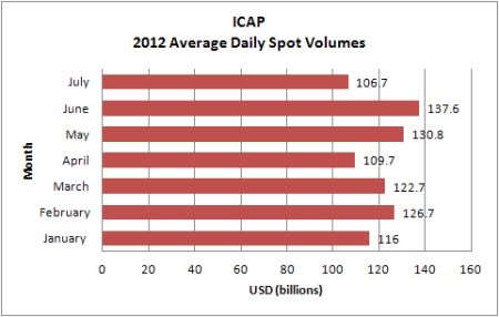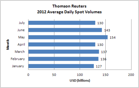 Thomson Reuters’ ADVs in July were $130 billion, down 9% month on month and 14% year on year from $152 billion in FX spot trading volume in July 2011.