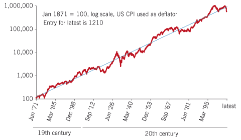 Chart 2 shows the astonishingly good and consistent progress of US stocks in the 138 years since 1871, clinging to the 6.75% growth trend-line for total real return: ie, capital gain plus dividends, minus inflation. This 138 years includes much greater stress periods than the past year, whose problems have been serious but grossly exaggerated.
