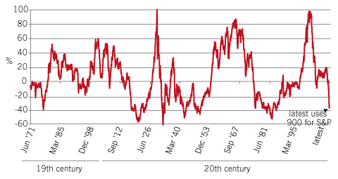 In P/E ratio terms, the US, on a trailing ratio of 11 to 12 for operating earnings, can have a one-third earnings fall in the recession and still be on the long-run P/E of 17, even with recession-trough profits. The European P/E ratio is an even more nugatory 8. Japan looks particularly cheap, as Japanese companies are cash-rich and do not distribute much of their profit, enabling them to take advantage of undervalued assets worldwide. Why are stocks so cheap? The answer is forced selling by hedge funds and the like. These are the classic conditions in which savvy investors, who have conserved their cash when trouble obviously looms – as was the case in 2006/07 – can snap up what prove to be bargains. Why would they start now? One reason is that the US government buying mortgage derivatives should ease the crisis at its source. And then the clever ones – investors who are short – get very exposed as prices fall and their profits expand. There’s an old Wall Street saying: “Nobody ever made a loss by taking a profit.” Even the successful bears can only make a profit by eventually buying.