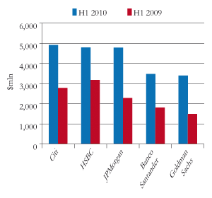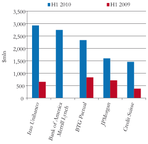 Latin American deal flows grew dramatically in the first half of 2010, according to league tables published by Dealogic. The data released for M&A, equity capital markets and debt capital markets transactions confirm that the region has shrugged off the difficult market conditions that characterized 2008 and large parts of 2009 to post record volumes. Senior bankers also report a strong pipeline for the remainder of 2010.