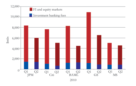 A sharp downturn in equity underwriting fuelled the decrease in overall investment banking revenues. JPMorgan’s equity underwriting revenues were down 68% from the same quarter last year, and down 14% since the first quarter of 2010.