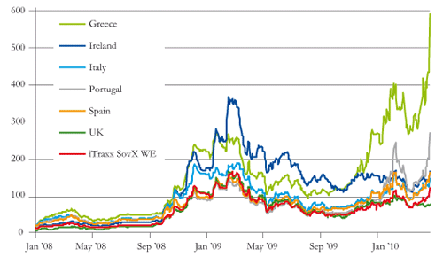 Politically, a restructuring might be unpalatable, and King attaches a higher probability to an “interim solution”, where Greece, probably at the insistence of the IMF, reschedules payments and/or tries to reduce the debt outstanding through a debt exchange. As long as this is done in a voluntary fashion, that is, one that is not legally binding on bondholders, it wouldn’t trigger CDS contracts. Nonetheless, it merely delays what some see as inevitable, and uncertainty still remains over whether the EU/IMF aid will provide support beyond 2010. In an April 11 statement, the support is described as a three-year package, with euro area member states covering “up to €30 billion in the first year”, with the IMF contribution assumed to be between €10 billion and €15 billion. But there has been no other official information about the subsequent years, which the EU says will be decided upon the agreement of the joint programme with the IMF.
