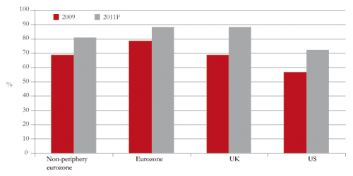 In 2008 the contagion was contained when policymakers implemented liquidity schemes, such as Talf and SLS, in addition to bank deposit and bank bond government guarantees. To that end, Citigroup suggests the most benign solution would be a socialization of the debt problem in the eurozone. They argue that it’s feasible in theory, given that the debt to GDP ratio of the eurozone as a whole in 2009 was only nine percentage points higher than for the core countries in isolation, and only moderately worse than the UK and US.