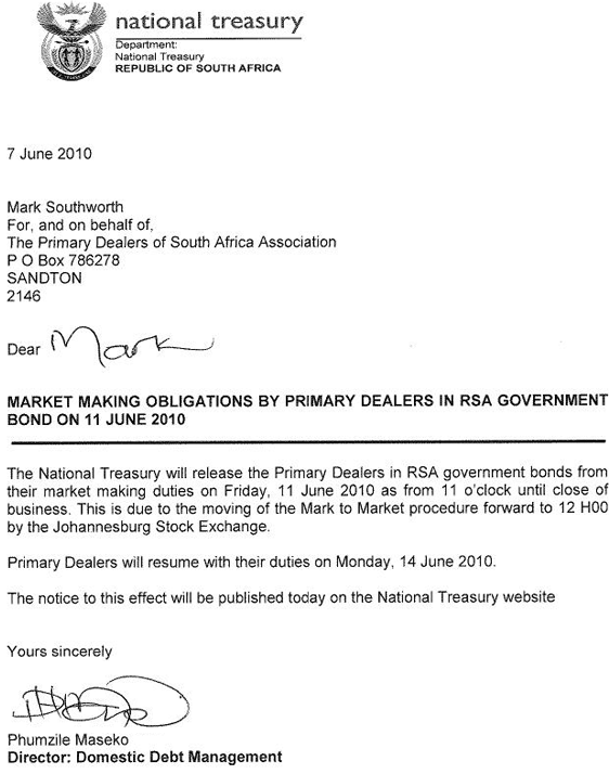 A copy of a letter from the South African national treasury arrived on my desk. Conveniently the treasury “will release the primary dealers in RSA government bonds from their market-making duties on Friday June 11 2010 as from 11 o’clock until close of business.” It’s called getting your priorities right.