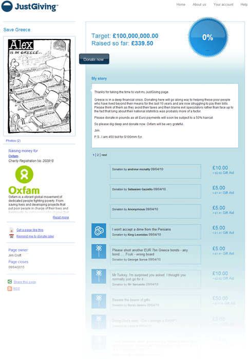 A site within ‘Just Giving’ is soliciting contributions to aid our Greek brothers in fiscal misery; or Oxfam. Read the comments, join our friends Merkel, Strauss-Kahn, Trichet, Zhou and, er, the British Museum in rescuing the home of plate-smashing democracy. Probably.