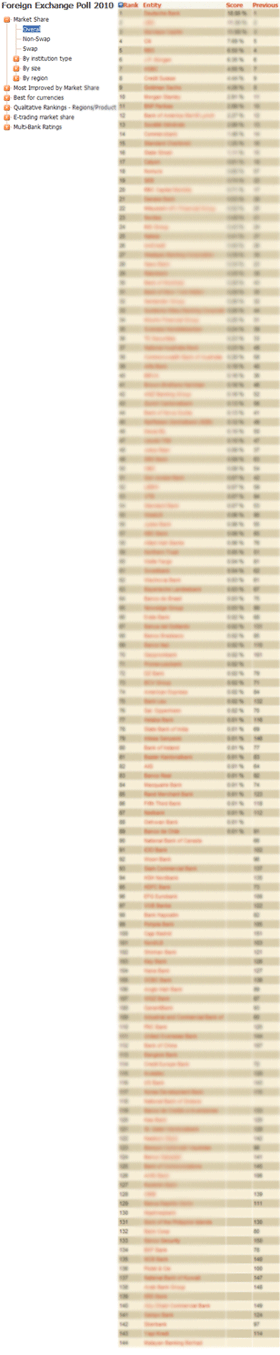 FX survey categories: Overall Market Share Most Improved Overall Market Share (by volume) Market Share by institution type: Most Improved Market Share by institution type: Market Share by size: Most Improved Market Share by size: Market Share by region: Most Improved Market Share by region: Qualitative Rankings – Best for currencies: Qualitative Rankings – Regions/Product Categories Research and Strategy: Options: Currencies: E-trading market share: Most Improved by E-market share: Qualitative Multi-Bank Ratings: |