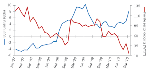 Private sector deposits with Irish banks and ECB funding to Irish banks |