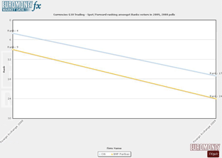 FX Poll: Currencies G10 trading – Spot/Forward ranking amongst bank voters in 2009, 2008 View the chart (will open in a new window) |