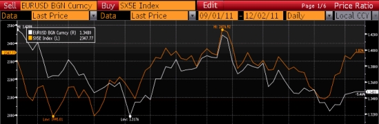 That said, with equities headed for their best week since 2009, currency markets are not displaying such exuberance, with EURUSD failing to sustain gains above $1.3500. This would suggest that investors remain sceptical that eurozone leaders can hammer out a deal to finally find a resolution to the debt crisis at a summit on December 9.