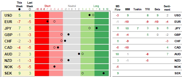 The market is in neutral territory in NZD and CHF, while GBP positioning moved from neutral to short as all proxies indicated sterling selling.
