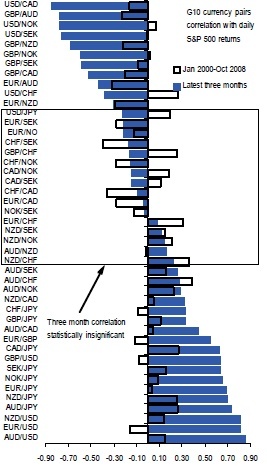 However, the full list of equity-FX correlations shows a clear pattern – that sterling still drops against traditional haven currencies, such as the dollar and the yen, in times of market stress and outperforms against higher-beta currencies, such as the Australian and New Zealand dollars.