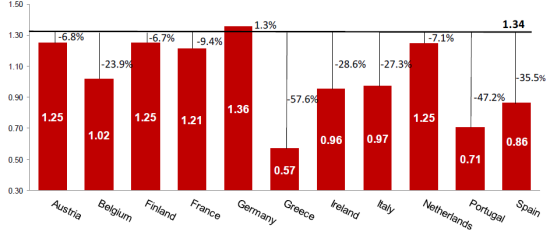 According to the analysis, only Germany would see the value of its currency rise, and then only by a marginal 1.3%.