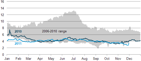 Source: U.S. Energy Information Administration, based on Bloomberg. Note: Data included through November 30, 2011. |