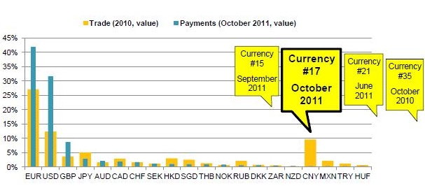 The RMB has now dropped two places to become the 17th most widely used payment currency, according to SWIFT data. In October 2010, RMB was ranked 35th by total value of payments and climbed to a peak of 15th in September.