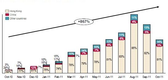 Although the number of financial institution that had RMB-denominated financial transactions increased marginally in October to 1,025, up from 1,001 the previous month, this still represents only 30% of the 3,200-plus companies that do business with China across currencies.
