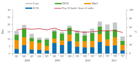In its investment banking strategy review for the first nine months of 2011, Dealogic noted that global investment banking revenue totalled $11.8 billion in the third quarter of 2011, down 45% on the previous quarter and down 31% from the third quarter of 2010, to become the lowest quarterly total since the first quarter of 2009 when markets were still frozen in the aftermath of Lehman Brothers’ collapse.