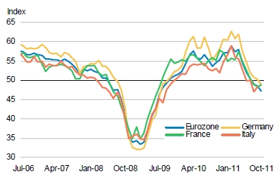 The euro is still vulnerable to the bleak economic outlook, regardless of political developments to contain the eurozone debt crisis. A sharp decline in European flash PMIs, especially the German manufacturing PMI’s fall below the psychologically important 50 level, is a warning signal of weak growth ahead. Indeed, concerns about recession seem to have become widespread.
