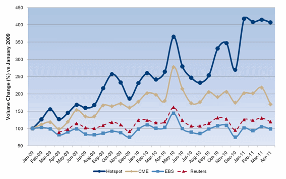 “Although Hotspot FX volume slightly declined in April 2011, we vastly outperformed all competitors in both month-on-month and year-on-year measures,” the firm said in statement (see graph).