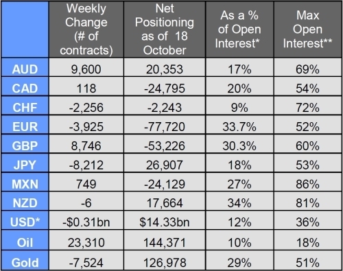 Issued on Friday by the Commodity Futures Trading Commission, the report showed that USD net longs fell only modestly from 114,795 on October 11 to 110,724 on October 18. Meanwhile, the net short in euros edged higher to 77,720 from 73,795, despite European policymakers’ apparent efforts to accelerate plans toward a comprehensive resolution to the crisis.