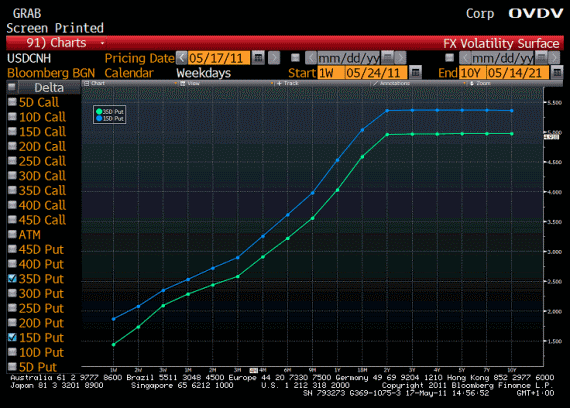 Why the anomaly? Traders say that it is mostly a function of supply and demand dynamics, and in particular the heavy supply around at-the-money vols. This has pushed higher delta options lower, whilst 15 delta options on the downside have conversely seen good buying from hedge funds, another CNH market maker says. He adds that there is probably a premium built into the downside in CNH due to the risk of a one-off revaluation in renminbi.
