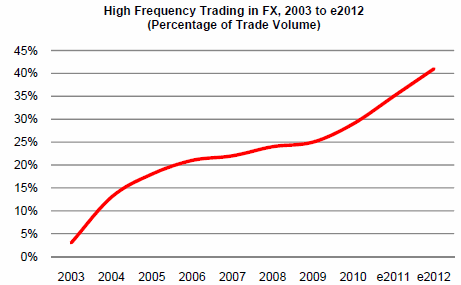 The report says algorithm trading constituted just 7% of trades at the end of 2010, while high-frequency traders, referred to as automated traders in the report, account for 29% of overall trade volume. The influx of HFT firms from the equity and futures markets, already accustomed to automated trading and looking for the sort of sophisticated execution tools they use in the equity markets, are likely to swell those numbers to 40% by 2014, the report says.