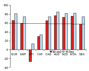As recently as August 2010, positions in risk currencies were overwhelmingly short — now they are long across the board, in particular in respect of the Australian and New Zealand dollars and Norwegian krone.