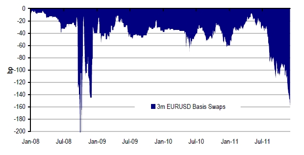 The three-month EURUSD cross currency basis tightened from -60bp to -120bp and has now moved back to around -140bp. The three-month swap has had a range of +7 to +23bp, now +16. These are huge moves given the volumes traded.