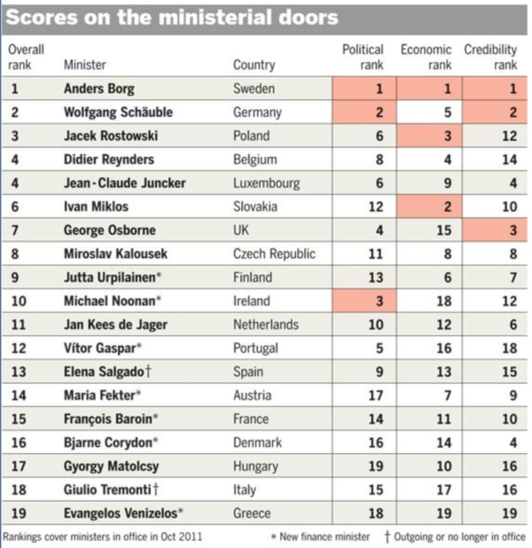 So George Osborne, Chancellor of the Exchequer for the UK’s ruling coalition party, seems to have fared well in an FT Research table that scores European finance ministers, by reaching 7.