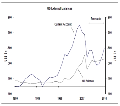 As the US net oil import position accounts for the majority of America’s external imbalances, less reliance on foreign oil supplies would lead to a sharp improvement in its current account deficit.