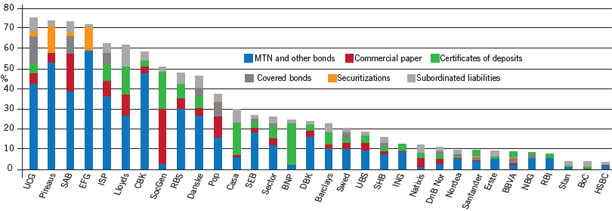 Roger Doig, credit analyst at Schroders, a UK-listed asset manager with £205 billion of funds under management, says that many bond investors are sticking with short-term bank debt of under two years’ remaining maturity only because they cannot sell it without taking a large mark-to-market loss. He says: “The decision has been taken to cut unsecured funding to banks with problem sovereign or other credit exposures such as real estate loans that investors suspect have only been kept current through forms of bank forbearance.”