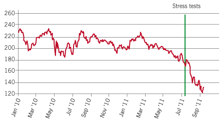 “Bankers complain that shareholders are unfairly undervaluing their shares at 0.6 times book or 0.4 times book just because of fear over sovereign risk. But when you really drill down through individual businesses, inside many of these banks there are clear signs of creeping devaluation. Businesses that the banks seem to think should be worth €4 billion are in fact probably worth only half that or less if recession takes hold. Shareholders are right.”