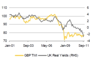 While the pound is hardly poised for a massive rally given the weak UK growth outlook and the vulnerability of the British banking system, the currency may nevertheless benefit as real yields in the UK- currently among the lowest of G4 countries – look set to improve in coming months.