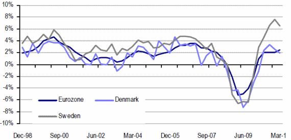 Real GDP growth (year-on-year) Denmark, Sweden, Eurozone |