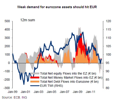 Chris Turner, head of FX strategy at ING, says the prospect of negative overnight interest rates should be a reminder that eurozone money-market funds will not be the place to invest in 2013. The chart below underlines the fact that portfolio flows are a substantial driver of EUR pricing.