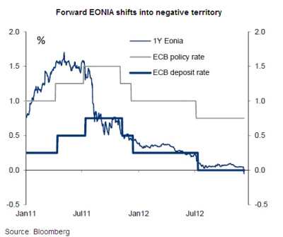 However, the fact that EURUSD found support around $1.29 might come as a surprise, given that the Eonia futures curve subsequently shifted to price-negative overnight interest rates in the eurozone for the first time ever.