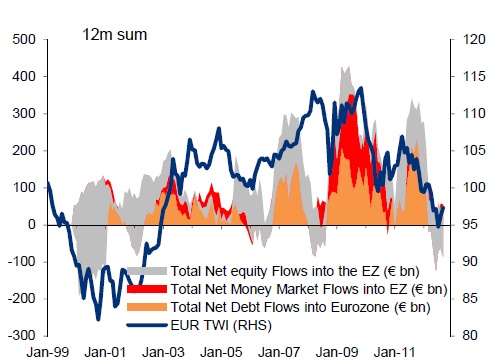 Furthermore, if eurozone growth does come in at -0.3% in 2013, flows into eurozone debt and equities look unlikely as well.