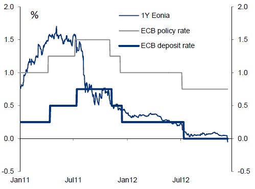 Chris Turner, head of FX strategy at ING, says the prospect of negative overnight interest rates should be a reminder that eurozone money-market funds will not be the place to invest in 2013.