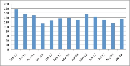to $115 billion compared with July, which were the lowest volumes level seen on the platform since 2009, excluding the typically slow month of December.Thomson Reuters’ September ADVs were at $176 billion in September 2011.