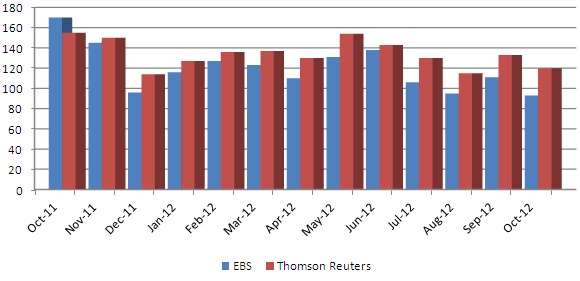 Thomson Reuters, which overtook EBS as the world’s biggest FX trading venue last November, reported average daily volumes fell to $120 billion on its main FX spot trading services – Thomson Reuters Dealing, Matching and Reuters Trading for FX – in October.