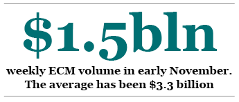 The average weekly volume of equity capital raised in Asia this year stands at $3.3 billion. But in the week beginning November 12, volumes were down to $1.5 billion. In the week before that, volumes were slightly better at $2.2 billion. “While equity capital markets are open, there is no doubt that volumes have dipped,” says Kendall. “It’s been the same all year in that the debt market has been a little more open than equity.”