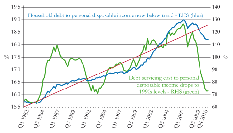 The US consumer has reduced debt to below the trend line of those debts to income. And the servicing cost of that debt is also way down. So releveraging there might provide a boost to US consumption and GDP. However, the trend line of US household leverage reflects the successive credit bubbles of the past 25 years and is still too high. And households might save more to offset excessive US deficits and debts, where nothing good is happening. In any case, a reduction in household thrift (the savings rate has already fallen to 3.5% of disposable income from over 6%) is hardly a return to healthy balanced growth, even if the market would rejoice at the prospect.