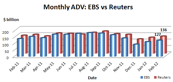 Volumes on Thomson Reuters have been higher than on EBS since November 2011, having lagged slightly behind its main rival for the majority of 2011.