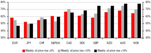Indeed, research from HSBC shows that the Norwegian krone is the most highly correlated currency with out-sized oil price gains.