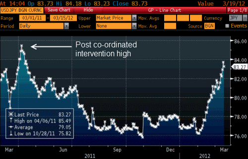 Indeed, USDJPY broke above ¥84 in Tokyo hours on Thursday. That was the first time it breeched that level since April 2001, after the co-ordinated central bank intervention to weaken the currency in the wake of the volatility after the earthquake and tsunami that triggered a nuclear disaster in March.