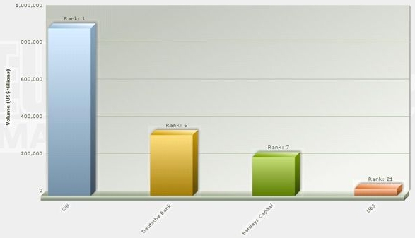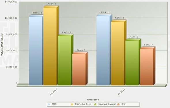 As far as the corporate business is concerned, it’s an area the bank knows there is still a lot of work to do. Athanasopoulos says that while the bank is a market leader among Swiss corporates, it has not been able to replicate that success outside its home market. The bank has seen its market share drop from fifth, with a market share of 7.43% in 2009, to a lowly ninth in last year’s poll, with a market share of under 4%. That puts UBS almost two percentage points behind BarCap, which had a share of 5.95%, and more than 8% behind Citi, the market leader among corporates with a share of 12.55%.