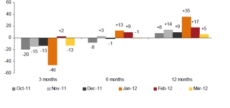 Commerzbank’s FX Compass Index, which canvasses the opinion of more than 1,000 German importers and exporters every month, showed that sentiment during the three-month horizon turned unambiguously negative towards EURUSD in March. That followed a brief move into positive territory in February, after the second bail-out deal for Athens eased worries over eurozone sovereign debt and the European Central Bank’s long-term financing operation helped lower concerns over the health of eurozone banks.