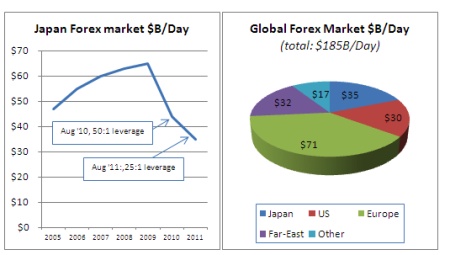 He cites 2011 results from Swiss-listed Compagnie Financière Tradition (CFT), which owns 49.5% of Gaitame, one of Japan’s leading retail FX companies. CFT reported revenue at Gaitame fell 46% in 2011 to SFr58million ($64 million), which, using industry standards, translates into $55 billion of monthly trading volume.