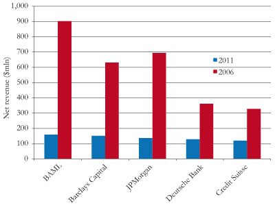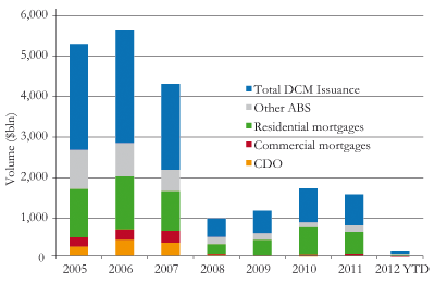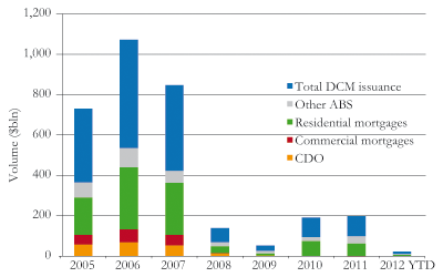 According to Dealogic, total securitization issuance in 2005 was $2.6 trillion, with the product accounting for 43.6% of all DCM activity. Fast forward to 2012 and year-to-date global securitization volumes stand at just $50 billion – a mere 6% of total DCM activity. In Europe, where securitization as a percentage of DCM activity peaked in 2006 at 22.5%, it now stands at 2.8% for 2012 from a total of just six deals. And the $11.2 billion raised from those six transactions is accounted for almost entirely by UK RMBS master trust issuance. The balance comes from Dutch RMBS, UK credit cards and auto receivables deals.